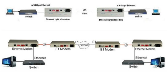 The ETH Fiber Modems can be used with E1 Fiber Modems and switches to connect two or more host.