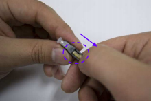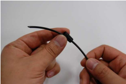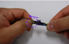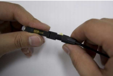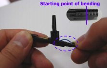 8. And maintaining the cable bending with right hand, push the connecting holder forward to the end and fix the fiber. |