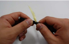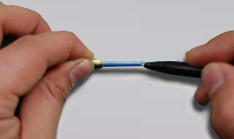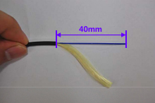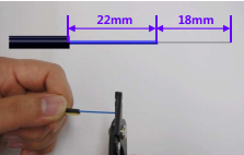 5. Strip the coating of 900/250㎛ from the end of 900㎛ to the point of 22mm marked(about 18mm) and clean the fiber using the alcohol and gauze. |