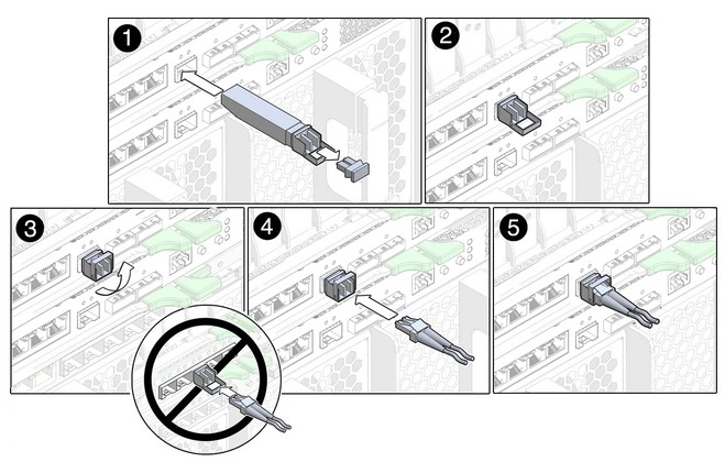 - Always keep the protective dust plugs on the unplugged fiber-optic cable connectors and the transceiver optical bores until you are ready to make a connection.