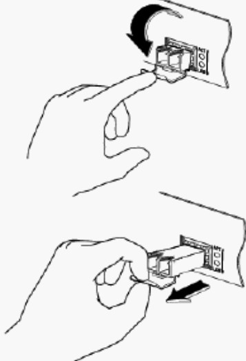 If the SFP transceiver has an Actuator button latch, gently press the actuator button on the front of the SFP transceiver until it clicks and the latch mechanism releases the SFP transceiver from the socket connector. Grasp the actuator button between your thumb and index finger, and carefully pull the SFP transceiver straight from the module slot.