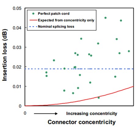 The final fiber-core-to-ferrule-OD concentricity, or connector concentricity, is the vector sum of all the misalignments. This is one of the most important parameters in defining a “perfect patch cord”. A “perfect patch cord” must have sub-micron connector concentricity. Figure 1 relates insertion loss with connector concentricity.