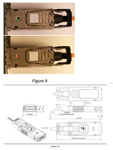 The CX-4 active optical cable provides status LEDs at each connector end to facilitate installation. Refer to Figure 9 and Figure 10.